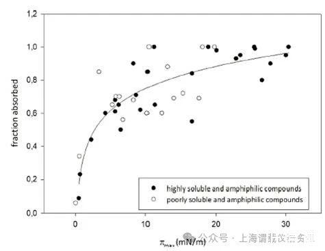 图5、两亲性化合物的πmax(表面压力)与PMPAM膜的表观渗透率相关性。从图中可以看出七个化合物πmax值在介于0和10 mN/m还揭示了低的跨膜渗透性。相比之下,对于化合物πmax值在20至40 mN/m时对PAMPA膜的通透性高。
