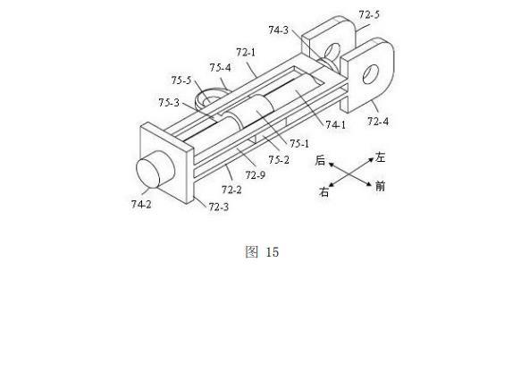 如图10、图11和图14所示,滑动座72活动设置于固定座71上。滑动座72的第一U形板72-1和第二U形板72-2的左端均穿入固定座71的左边框的第一方孔71-3内,第一U形板72-1和第二U形板72-2的右端均穿入固定座71的右边框的第二方孔71-4内;盖形板72-3的左侧面与固定座71的右边框的右侧面相抵接,使得盖形板72-3对滑动座72起限位作用;第一尾板72-4和第二尾板72-5的右端面均与固定座71的左边框的左侧面相抵接,使得第一尾板72-4和第二尾板72-5对滑动座72起限位作用,并且第一尾板72-4和第二尾板72-5均位于第一延伸板71-5与第二延伸板71-6之间。