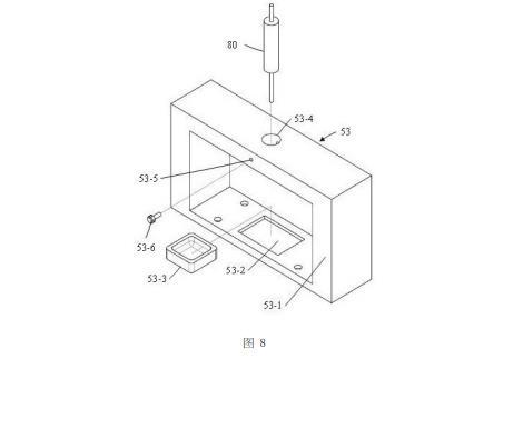 如图8所示,第三窗形件53的第三边框部53-1的下边框上设置有一个例如长方形的凹坑53-2,并且沿左右方向凹坑53-2位于第三边框部53-1的中间位置,凹坑53-2内设置有一个积液盆53-3。第三窗形件53的第三边框部53-1的上边框上设置有一个例如圆形的第三通孔53-4,第三通孔53-4沿竖直方向延伸,并且第三通孔53-4位于凹坑53-2的正上方;注射器80包括主体管80-1和固定设置于主体管80-1下端面的针管80-2,主体管80-1和针管80-2均为内部中空的圆形管,并且针管80-2的直径小于主体管80-1的直径,针管80-2与主体管80-1的内部空腔相连通;注射器80的主体管80-1固定设置于第三通孔53-4内,并且针管80-2的末端刚好与摄像机61的中心轴线(即光源62的中心轴线)相交。在本实施例中,第三窗形件53的第三边框部53-1的上边框的侧面设置有一个沿前后方向延伸的第一螺纹孔53-5,并且第一螺纹孔53-5与第三通孔53-4相连通;螺栓53-6设置于第一螺纹孔53-5内,螺栓53-6的外螺纹能够与第一螺纹孔53-5相啮合,并且螺栓53-6的里端能够与注射器80的主体管80-1外壁相抵接,从而使得注射器80的主体管80-1固定设置于第三通孔53-4内。