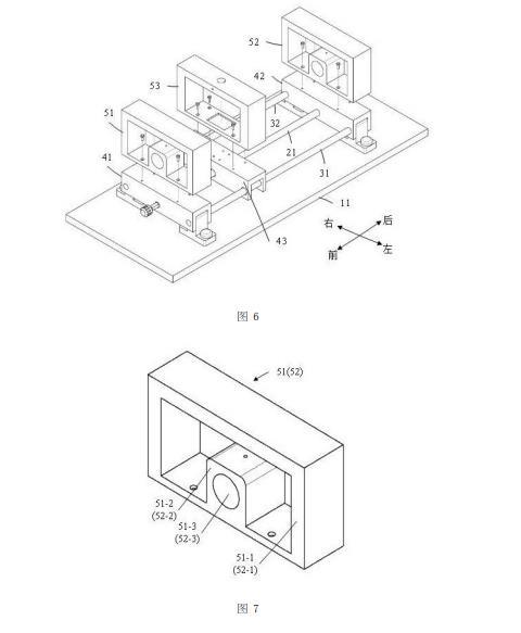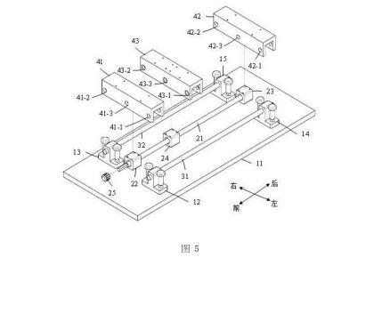 第一导杆31从前往后依次穿过第一左通孔41-1、第三左通孔43-1、以及第二左通孔42-1,第一导杆31的前端与第一左通孔41-1固定连接,第一导杆31的后端与第二左通孔42-1固定连接;第二导杆32从前往后依次穿过第一右通孔41-2、第三右通孔43-2、以及第二右通孔42-2,第二导杆32的前端与第一右通孔41-2固定连接,第二导杆32的后端与第二右通孔42-2固定连接。第一丝杆21从前往后依次穿过第一中间通孔41-3、第三中间通孔43-3、以及第二中间通孔42-3。