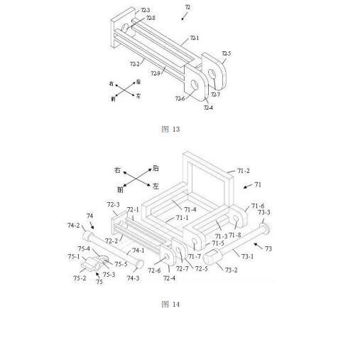 如图13所示,滑动座72包括第一U形板72-1、第二U形板72-2、盖形板72-3、第一尾板72-4、以及第二尾板72-5。第一U形板72-1和第二U形板72-2的开口端都与盖形板72-3的左侧面(即里侧面)固定连接,并且第一U形板72-1和第二U形板72-2均与盖形板72-3相垂直,其中盖形板72-3沿竖直方向延伸且盖形板72-3上设置有通孔72-8,第一U形板72-1和第二U形板72-2均沿水平方向延伸;第一U形板72-1位于第二U形板72-2的上方,第一U形板72-1与第二U形板72-2相互平行且二者之间设置有一个缝隙72-9。在本实施例中,第一U形板72-1与第二U形板72-2相同。