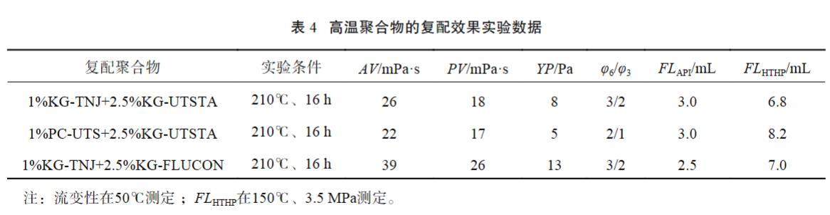 室内以滤失改善效果较好的1%DrilFILHT为基础,考察增黏剂KG-TNJ、PC-UTS与2种抗超高温改性淀粉的复配效果,选定材料最佳组合。评价配方:基础配方+1.0%DrilFILHT+复配聚合物,实验结果见表4。