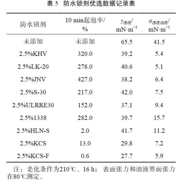 前期钻井作业期间,钻开储层前低渗透钻开液体系中加入了防水锁剂材料,发现加入后出现了起泡问题,加入消泡剂后有一定效果但是循环和再加入防水锁剂时又会出现起泡情况,一定程度上影响了正常作业。另外,由于起泡问题,会将空气中氧气携带进入钻井液中,在井底高温环境中会加速钻井液中聚合物材料的降解。为了解决起泡问题,同时预防低孔低渗储层的水锁伤害,室内开展超高温低渗透钻开液体系配套防水锁剂优选试验。