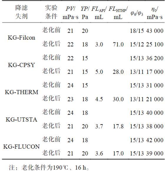 室内对4种高温聚合物增黏剂材料进行了单剂抗温性能对比评价。其中KG-TNJ为温敏疏水缔和聚合物提黏剂,DrilFILHT为纳米片状氧化镁酚醛树脂改性聚合物增黏降滤失剂材料,Drilloss F为纳米微球聚合物复合增黏聚合物材料,PC-UTS为某国外代表性高温聚合物材料。评价配方:基础配方+2.5%KG-UTSTA+聚合物,实验结果见表3。
