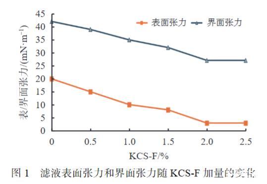 图1滤液表面张力和界面张力随KCS-F加量的变化