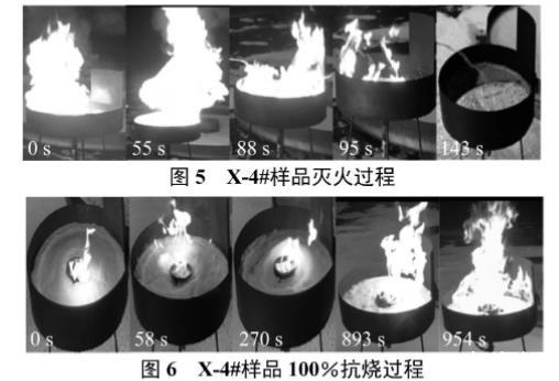 实验所设计X-4#样品的灭火机理主要通过泡沫层的积累,泡沫逐渐覆盖整个油面,形成有效的覆盖层,进一步降低了燃烧面积和火焰温度。在灭火的过程中,泡沫覆盖层可以有效地终止燃烧,防止再燃的发生,直至整个油面燃烧被进一步削弱和熄灭。本文中的配方主要通过在燃烧液体表面的覆盖和冷却,从而减少燃料蒸汽的蒸发并隔离燃烧所产生的热辐射,从而达到有效灭火。而X-4#样品难以快速形成水膜,延长了泡沫在汽油表面的铺展速度,导致灭火时间长于3%AFFF。但X-4#样品的灭火时间优于X-0#样品,表明XG的加入提高了泡沫的热稳定性,但其高粘度影响了泡沫在油面的铺展速度[12],X-0#样品的泡沫热稳定性差,在灭火过程中大量的泡沫破裂不利于形成能有效终止燃烧的泡沫覆盖层,导致灭火时间大于X-4#样品。