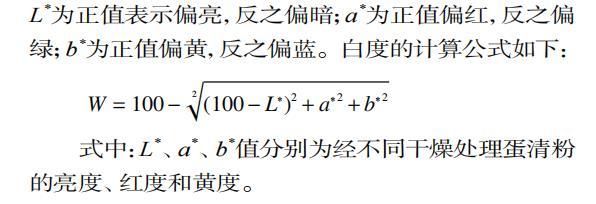 式中:L*、a*、b*值分别为经不同干燥处理蛋清粉的亮度、红度和黄度。