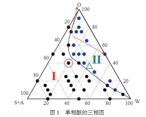 通过拟三元相图制备单相酸相图,根据油相(O)、酸相(W)、表面活性剂(S)+助表面活性剂(A)的比例进行三相图的绘制。室温下,固定油相(O)的加量,固定非离子表面活性剂(S1)与阳离子表面活性剂(S2)的质量比,固定表面活性剂(S,S=S1+S2)与助表面活性剂(A)的质量比。将不同比例下的液体进行离心,然后进行观测,观察体系由澄清透明(一相)变为混浊(二相)的相变过程,在每次发生相变的同时记录所滴加盐酸的量,以O、S+A、W为三相,绘制拟三元相图,见图1。由图1可知,在图1的红圈标记区域,配方的经济性最好,是维持单相区域最小的表面活性剂用量(S+A),且该配方下的单相酸遇水遇油后仍可在较大范围内保持单相。