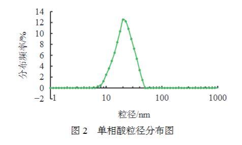 采用激光粒度分析仪对单相酸粒径及分布进行了测定,实验结果见图2。可知单相酸粒径大小分布在7~50 nm范围之内,分布较窄,为高斯分布,在单相微乳粒径范围内。