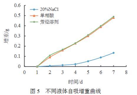 设置不同液体进行自吸实验,对比亲油岩心对于不同液体的自吸能力,实验结果见图5。对孔隙介质而言,润湿性控制两相或多相流体的分布和流动。平衡时湿润相与孔隙表面相互接触,而非湿相占据孔隙的中央位置,介质中发生两相或多相流动时,毛管力与湿相流动方向一致,是非湿相自发进入岩心介质驱替润湿相的阻力,对于油湿岩心介质,很难发生水的自吸。从实验结果可以看出,单相酸自吸效果和芳烃溶剂十分接近。