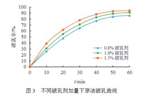 将单相酸与原油高速搅拌混合制备乳状液,油水比3∶2。分别加入0.8%、1.0%、1.5%二酸二辛脂磺酸钠破乳剂,水浴90℃,静态放置,每隔10 min测量析出量,计算破乳率,实验结果见图3。加入1%破乳剂后,单相酸破乳率在1 h内可达到90%以上。