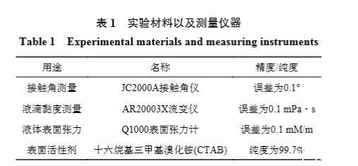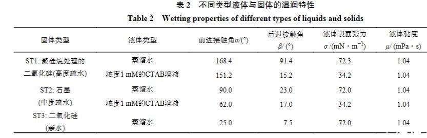 由于固、液两相的表面特性会显著影响固−液接触角,从而影响液滴与颗粒的碰撞行为,笔者通过实验测量和文献分析,对比了固、液特性的变化对接触角的影响。表1列出了测量固、液特性时所使用的具体仪器及添加剂。表2给出了不同固体和液体样品的接触角、表面张力和黏度。其中高度疏水固体ST1与不同液体接触角通过实测得出,中度疏水固体ST2和亲水固体ST3的测量数据来自ZHU等的研究。对比后发现,前进接触角α明显大于后退接触角β,所以在分析尘−雾湿润特性时应考虑前进角和后退角的差异。