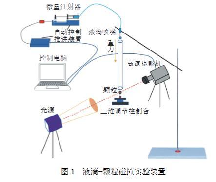 为确保每次实验保持一致,实验采用电自动微量注射器产生大小一致的实验液滴,并通过调节不同高度的注射器来改变液滴−颗粒碰撞速度。为防止环境气流对液滴轨迹的影响,在注射器下方设置了一个空心圆筒。在三轴光学平台上设置了样品颗粒支座,利用EVA热熔胶将样品颗粒固定在支座的金属支撑丝上。颗粒的位置可通过三轴光学平台进行调整。使用了Phantom VEO410L高速相机(Vision Research公司)对碰撞过程进行捕捉拍摄。相机和光源分别位于样品颗粒的两侧。相机的拍摄频率设定为2 000 fps,图像分辨率为1280×800像素。
