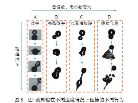 图8固−液颗粒在不同速度情况下碰撞的不同行为