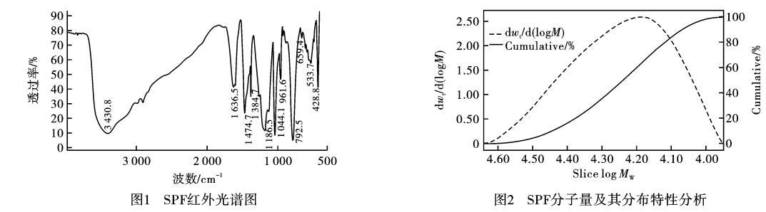 1)SPF红外光谱分析(IR)SPF红外光谱结果见图1,3430.8cm⁻¹为羟基伸缩振动峰,这不可能是醇羟基,而是酚羟基。3000cm附近有一个小峰,在1474.7cm是亚甲基变形振动峰,说明SPF中含有亚甲基。1636.5cm是苯环上的C=C键伸缩振动产生的特征吸收峰,在指纹区中的792.5cm⁻¹区域中的谱带是取代苯的1,2,6取代的特征吸收峰。1186.5cm⁻¹和1044.1cm⁻¹是由于S=O键伸缩振动产生的特征吸收峰,在700—500cm⁻¹的连续吸收峰是S—O、S—S、C—S键伸缩振动产生吸收峰。SPF产物的分子中含有磺酸基、羟基和亚甲基等官能团。
