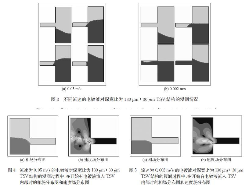 TSV深宽比设置为130μm:30μm,电镀液流人速度为0.05 m/s和0.002 m/s的浸润仿真结果分别如图3所示,前者在TSV底部形成气泡,后者可以完全浸润。模拟结果表明降低电镀液流入速度有利于浸润。通过仿真中两种情况下浸润过程中的流速场对比,可以看出在电镀液流入的过程中,电镀液流人速度较大时,如图4(b)所示,电镀液表面距离TSV较远的部分有着相对更大的流速,即电镀液流过TSV上方的速度大于电镀液向TSV内部流入的速度,导致在电镀液流过TSV上方时,其流入TSV内部的分流量还没有充满TSV内部排出其中气体之前,电镀液就已经流过了TSV上方,并将TSV口部封死,导致内部残留气体无法排出,形成不完全浸润;而当电镀液流入速度较小时,如图5(b)所示,电镀液表面在TSV口部附近具有相对更大的流速,即电镀液向TSV内部流入的速度大于其流过TSV上方的速度,使得电镀液流过TSV上方时,有足够的分流量流入TSV内部,将其中气体排出并将TSV填满,实现完全的浸润。