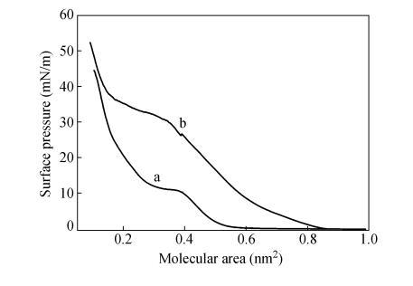 2种单体分子结构相似,CO2DA比CODA多了一CH₂-CH₂O一柔性间隔基,整个分子的舒展程度相对较大。当CODA分子在水面铺展时,与水分子的相互作用小,分子"平躺"在水面上,当膜障压缩单分子膜时,CODA分子受到侧向压力时容易发生滑移,形成多层膜。而CO2DA分子端基亲水性相对较强,当膜障压缩单分子膜时分子在水面能立起来,并与液面形成一定的夹角。因此CO2DA单分子膜占据面积较大,崩溃压较高。