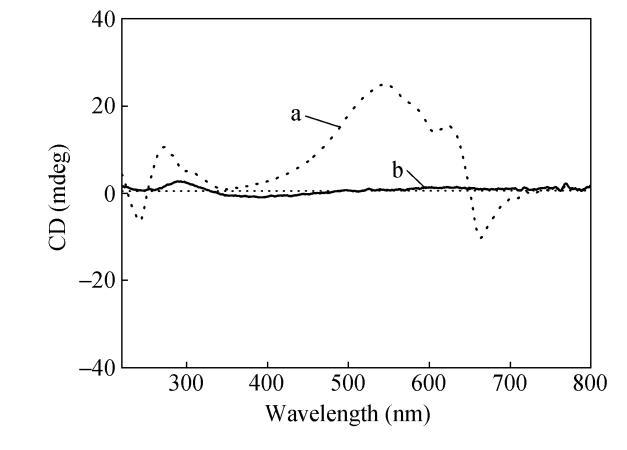 香豆素基团在紫外光照条件下可发生可逆的光二聚反应:在365nm光辐照下,香豆素基团能发生光二聚反应,在254nm辐照下香豆素二聚体能可逆地发生解二聚反应。可以预见香豆素端基的二聚化将影响香豆素取代二乙炔单体在气液界面的组装,从而影响聚二乙炔主链螺旋结构的形成。荔枝视频资源在线观看用365nm紫外灯辐照CODA氯仿溶液20min,此时香豆素端基能发生二聚,而二乙炔基团不会发生聚合。将得到的CODA二聚体的氯仿溶液铺展在水面上,沉积制备LB膜,制备得到的CODA二聚体LB膜能聚合成蓝相。CD光谱测试发现香豆素基团和相应的聚二乙炔吸收带均出现了明显的CD信号,但强度较CODA LB膜均有所减弱,如图8所示。