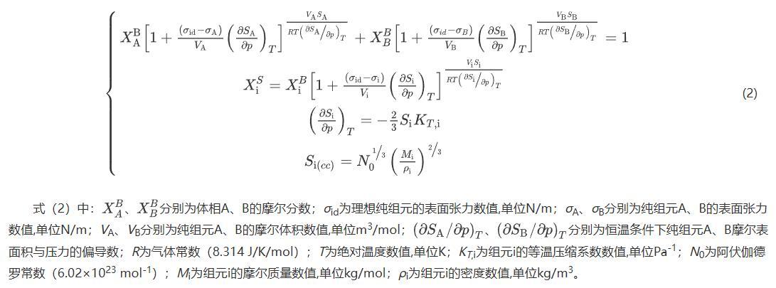 式(2)中:分别为体相A、B的摩尔分数;σid为理想纯组元的表面张力数值,单位N/m;σA、σB分别为纯组元A、B的表面张力数值,单位N/m;VA、VB分别为纯组元A、B的摩尔体积数值,单位m3/mol;