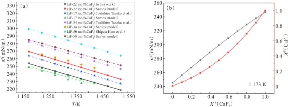 图2 LiF-CaF2熔盐体系表面张力(a)实验值与Santos模型计算值比较和(b)CaF2在表面相与体相含量关系