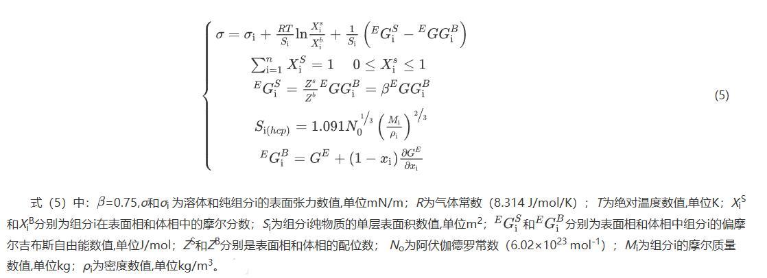 式(5)中:=0.75,σ和σi为溶体和纯组分i的表面张力数值,单位mN/m;R为气体常数(8.314 J/mol/K);T为绝对温度数值,单位K;XiS和XiB分别为组分i在表面相和体相中的摩尔分数;Si为组分i纯物质的单层表面积数值,单位m2;分别为表面相和体相中组分i的偏摩尔吉布斯自由能数值,单位J/mol;ZS和ZB分别是表面相和体相的配位数;No为阿伏伽德罗常数(6.02×1023 mol-1);Mi为组分i的摩尔质量数值,单位kg;ρi为密度数值,单位kg/m3。