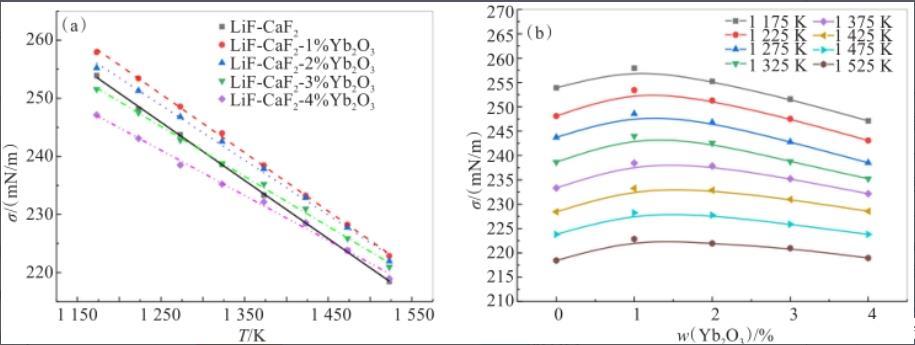 图3温度(a)和Yb2O3含量(b)对LiF-CaF2熔盐体系表面张力的影响