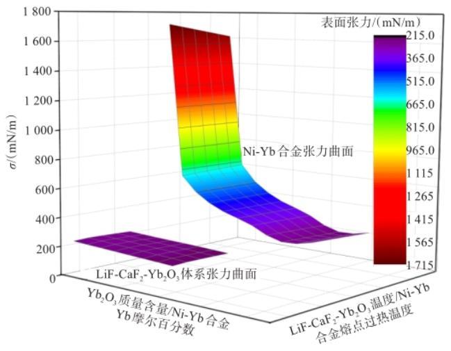图4 Ni-Yb合金与LiF-CaF2-Yb2O3体系表面张力曲面对比